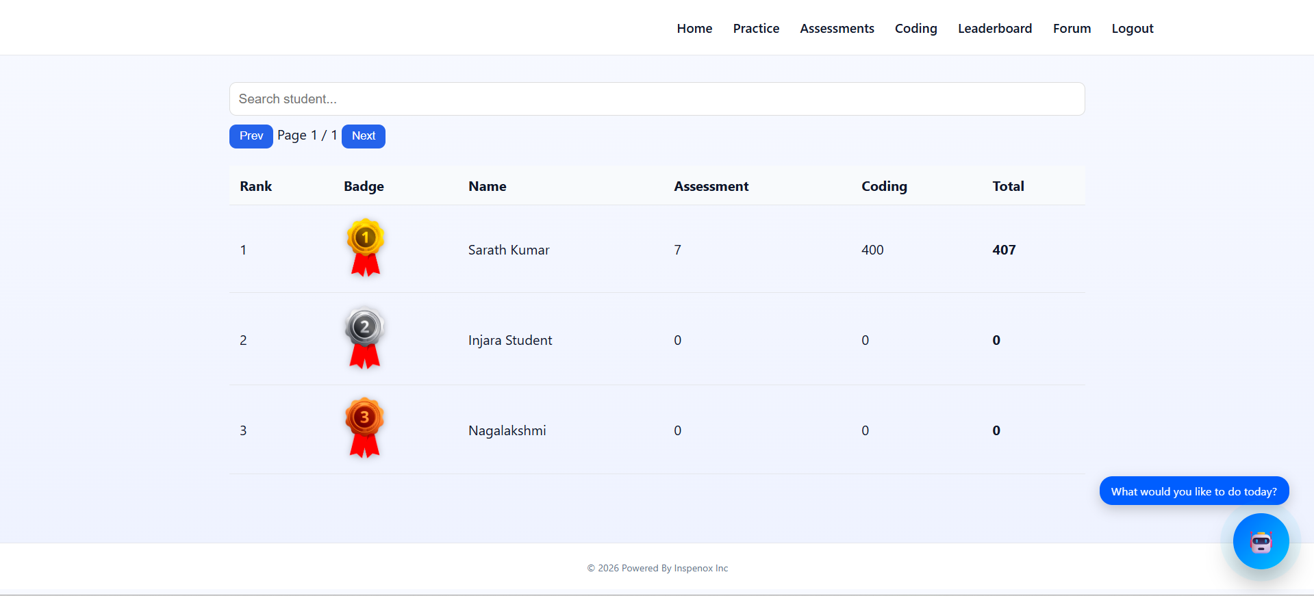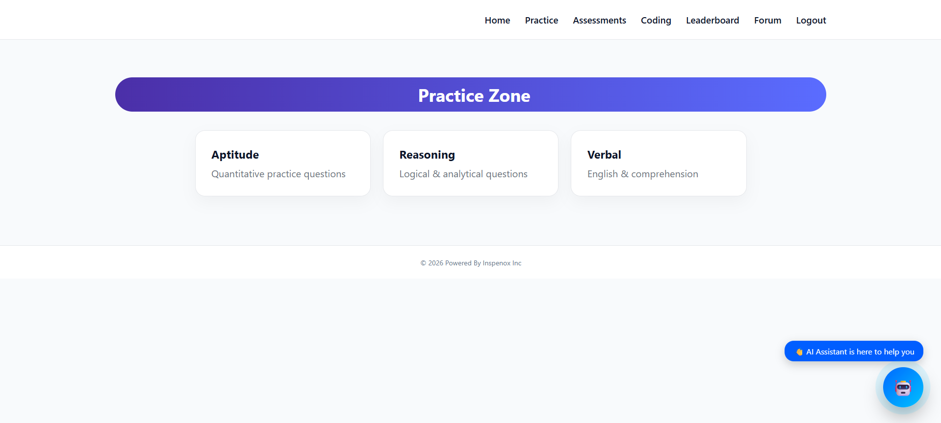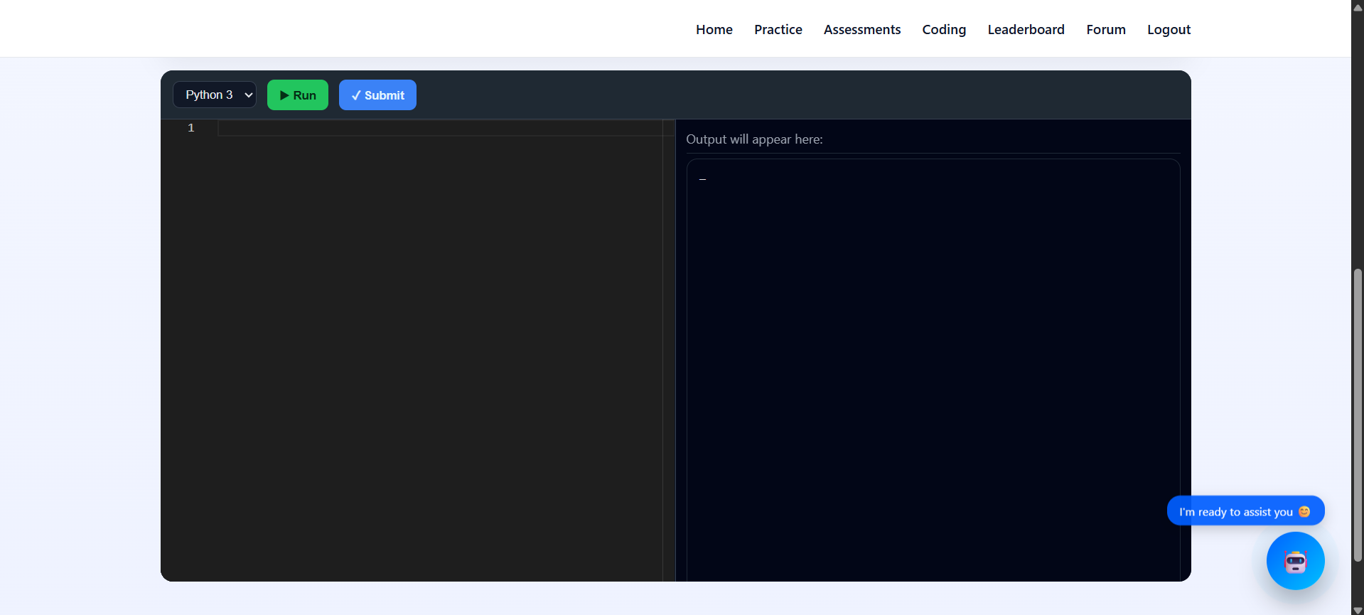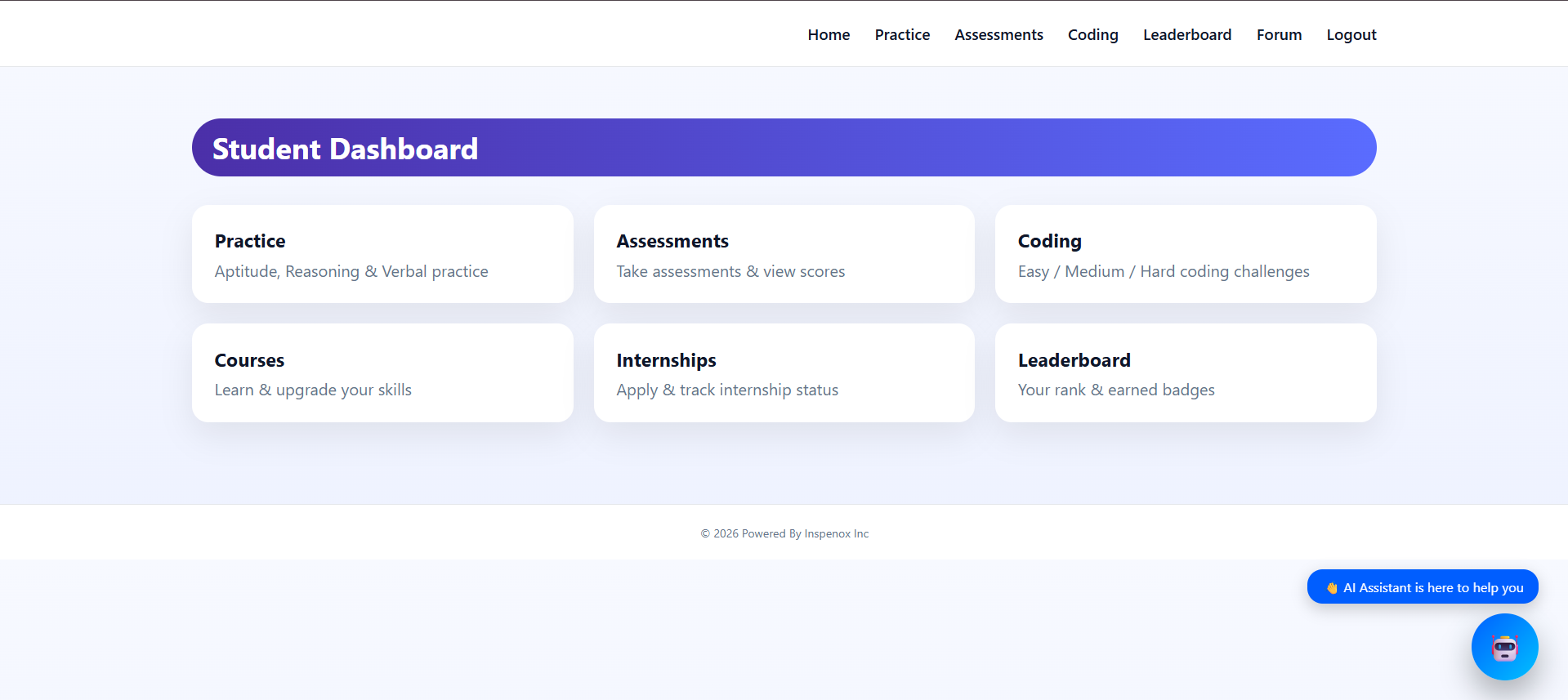 Central hub where students access practice modules, coding challenges, assessments, courses and leaderboard rankings.